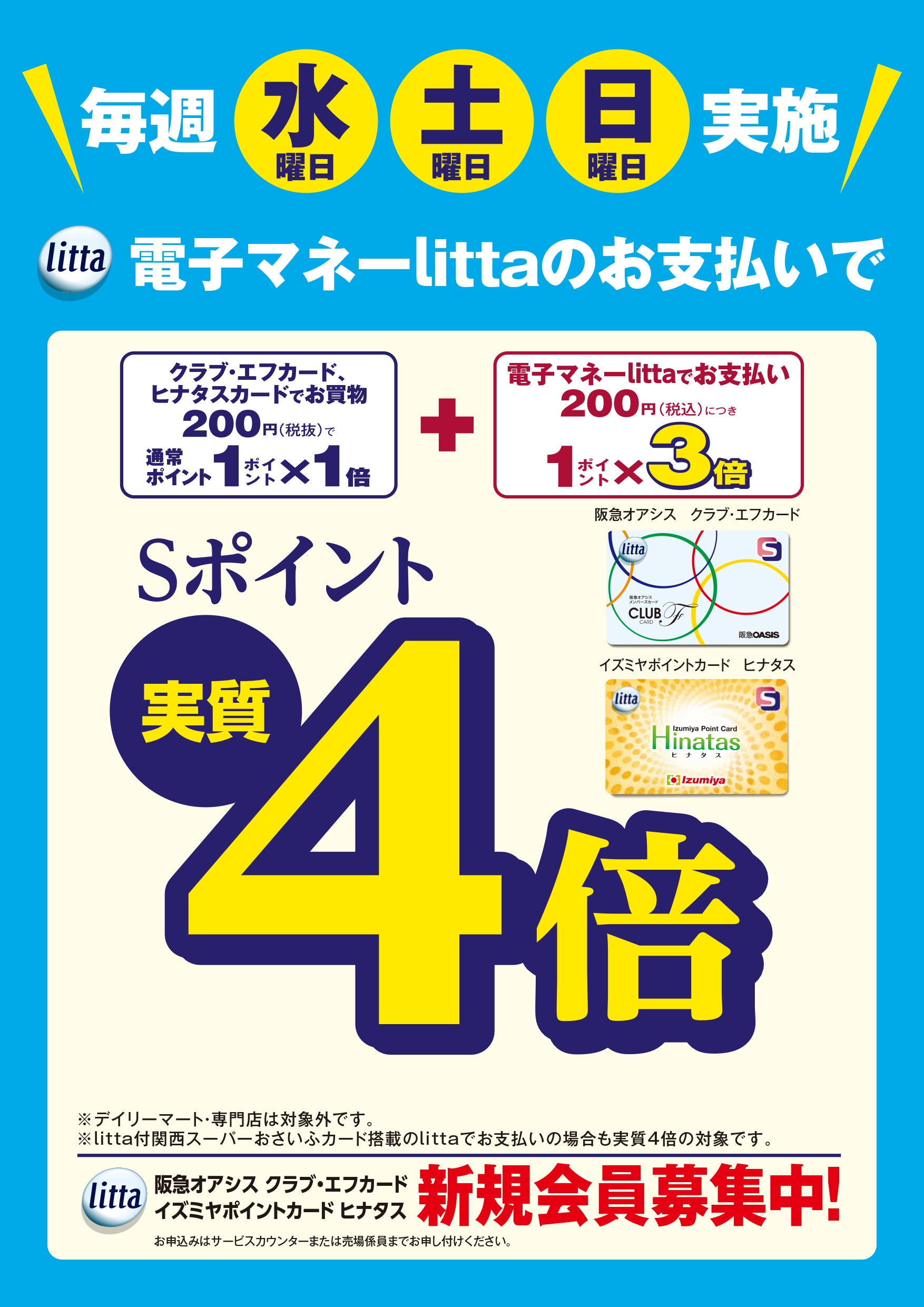 2026.04.07 特集 毎週水・土・日曜日実施!クラブ・エフカード、ヒナタス搭載の電子マネーlittaのお支払いで実質4倍ポイント! ※イズミヤデイリーマート原山台店・宝塚南口駅前店は実施しておりません。 前の記事 次の記事 特集一覧へ戻る